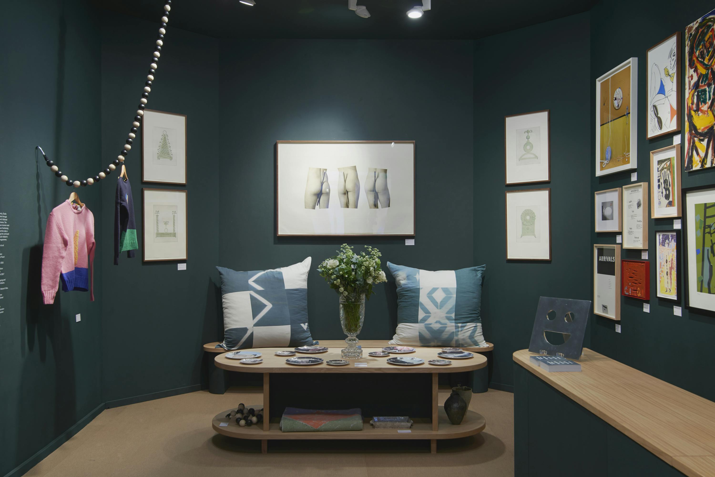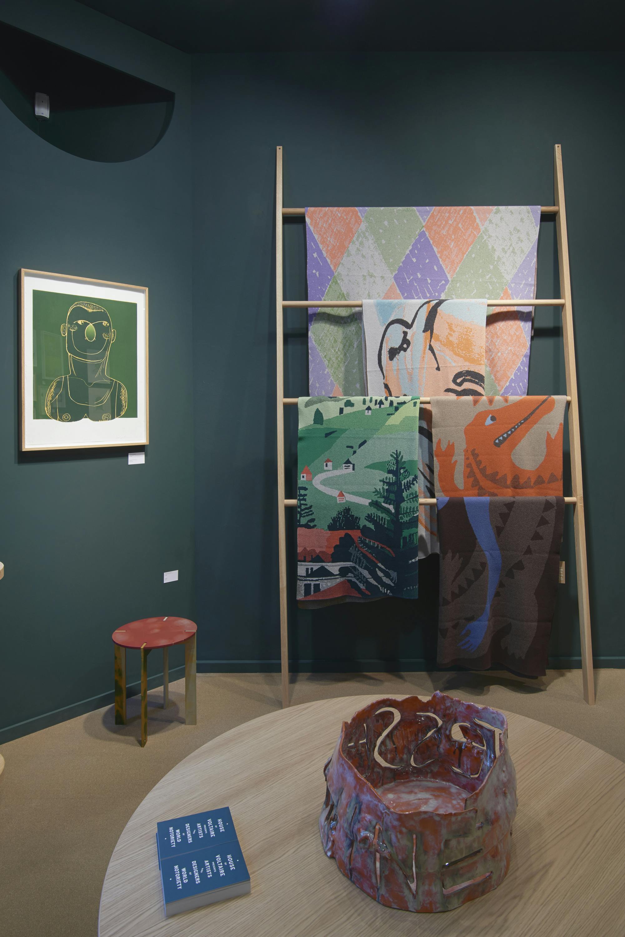 Exclusive artist and designer made products included: limited edition blankets by Michael Craig Martin; dining sets by Linder; a hand–tufted wall hanging by Jim Lambie; home wares by BLESS; Jeremy Deller bumper stickers, handmade Christmas decorations by fashion illustrator John Booth; beach towels by Blondey McCoy; slogan sliders by Cory Arcangel; slogan sweatshirts by Scott King; plant pots by Nikki Tibbles & Laura Aldridge; Aprons by Ed Ruscha; Christmas wreaths by fashion designer Matty Bovan; hand–painted coat stands by Hayley Tompkins; tea towels by Peter Saville; lambswool blankets by Sacai; ceramics by fashion designer Roksanda; glass vases by Prem Sahib; baby blankets by Ken Done; and embroidered jumpers by Alison Katz & Paolo Pecora.